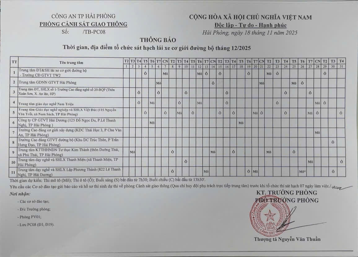 TRUNG TÂM ĐÀO TẠO & SÁT HẠCH LÁI XE THANH MIỆN xin thông báo đến quý học viên kế hoạch tổ chức sát hạch lái xe cơ giới đường bộ trong tháng 12 năm 2025. Thông tin chi tiết như sau: